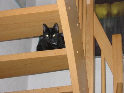 Das ist die kleine süße Eva wie sie durch die Gitterstäbe der Treppe guckt